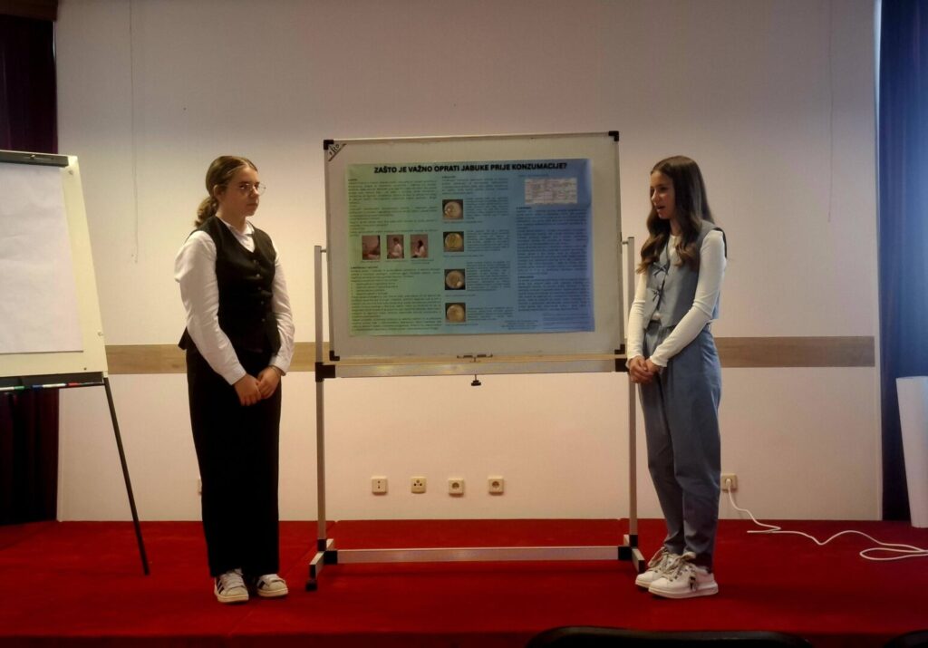 Na Državnoj smotri biosigurnosti i biozaštite, održane od 22. do 24. travnja 2026. u Crikvenici, učenice šestog razreda Franka i Lana uspješno su predstavile svoj istraživački rad „Zašto je važno oprati jabuke prije konzumacije?“ uz podršku mentorice Kornelije Sabljak.